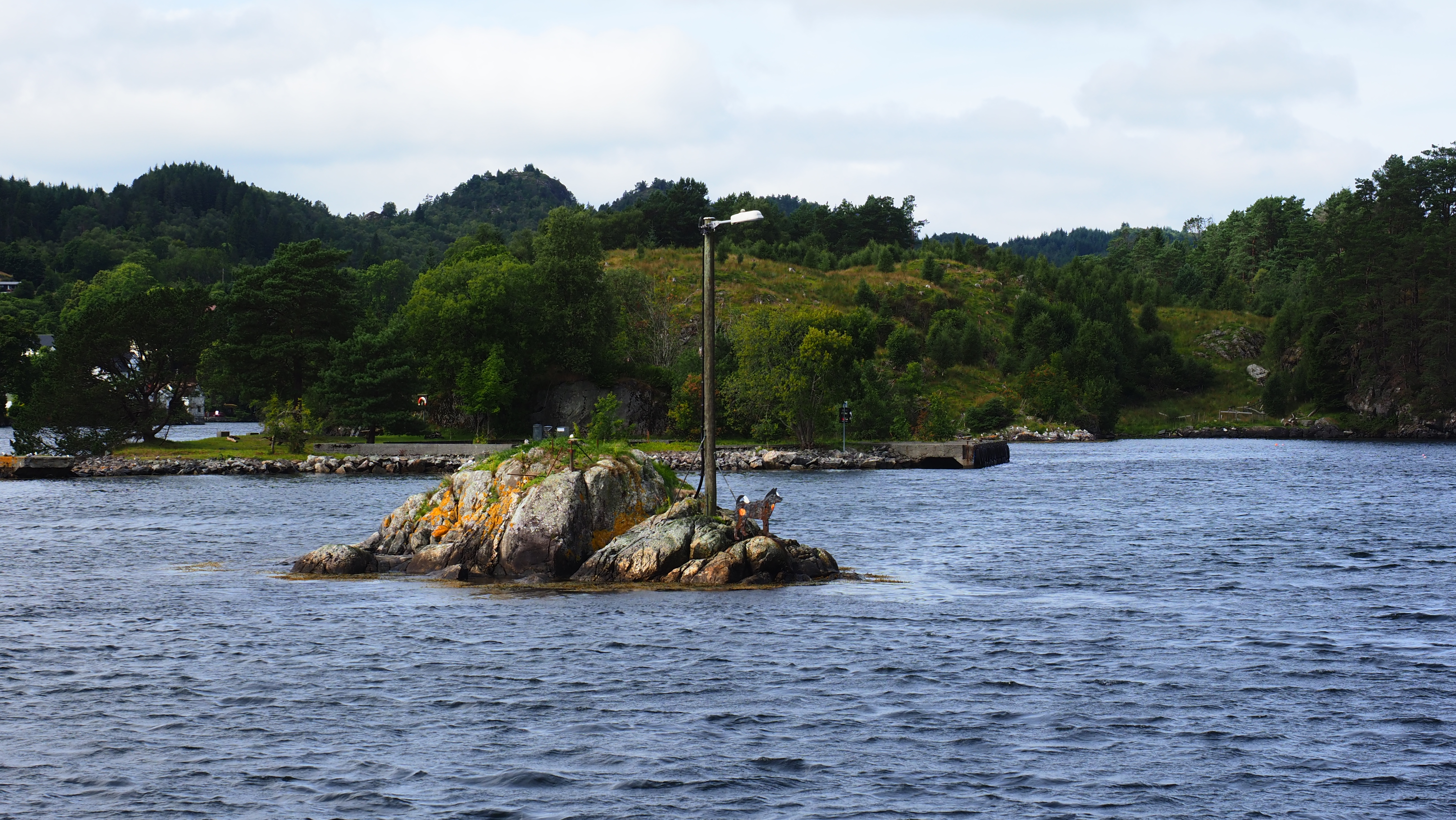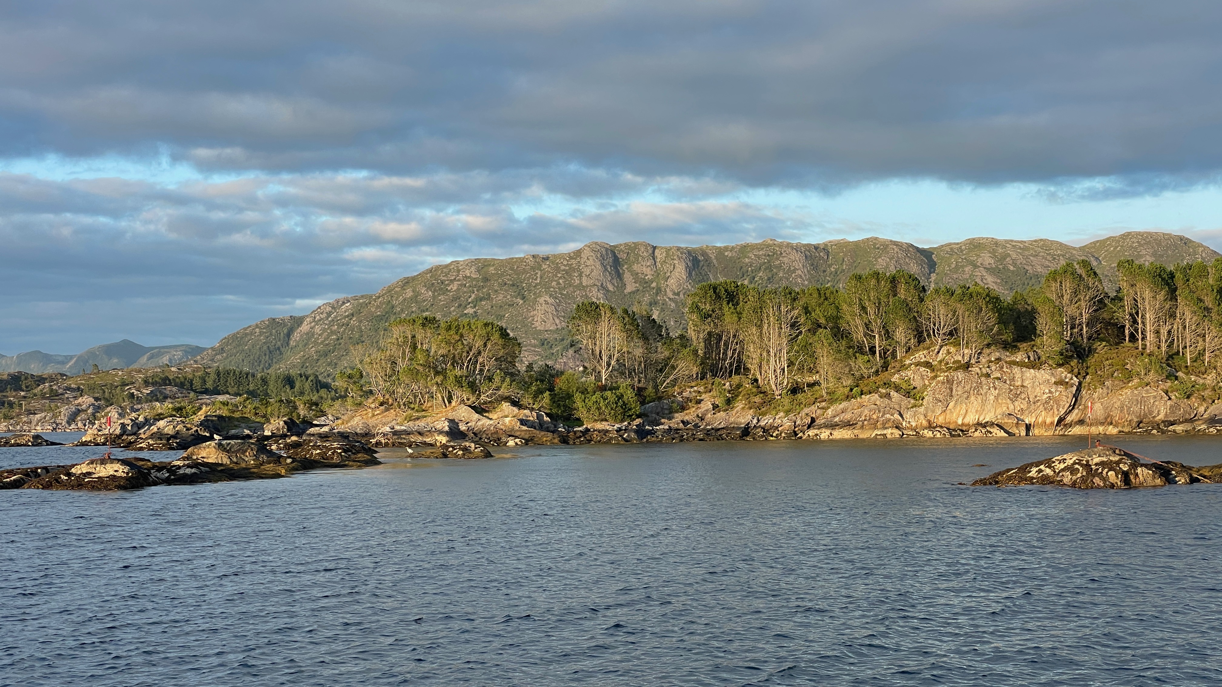 We hopen hier hulp te krijgen met ons accu probleem. Vanmorgen heb ik een hulp vraag op ZeilNoord gezet en daar kwamen mooie reacties op. Sommigen belde ook op en wij kregen van drie verschillende berichten dat Baardsen een goed bedrijf is. Ik had dat zelfde bedrijf ook al gevonden omdat Meine een nieuwe hengel nodig heeft. Zeilen richting Haugesund zit er ook nu niet in. We raken er aan gewend. We varen naar het licht. Zon op groene heuvels. In ieder geval heeft het vandaag totnutoe 12.00 uur nog niet geregend! Ik zie zelfs kleine stukjes blauwe lucht.
