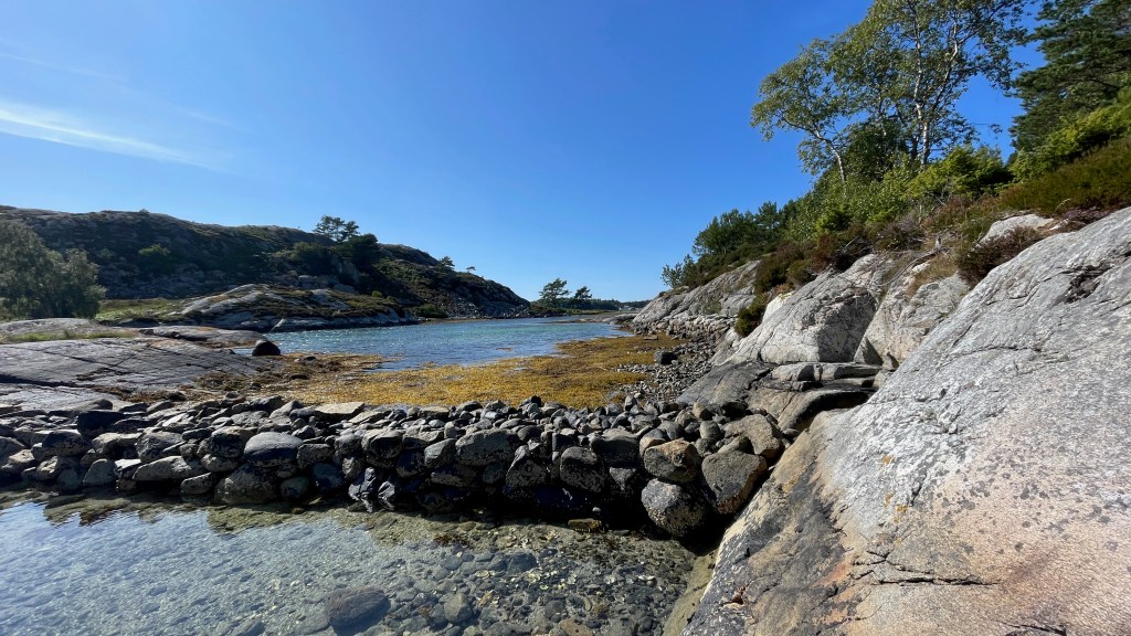 Het alarm voor het lage accu niveau gaat nog net niet af, dus geen elektriciteit gebruiken. Ook niet de pompen van de wc. We hebben dus nog steeds last van ons energieprobleem, maar we leren ermee om te gaan. Even later komt de zon op, zwakjes door de wolken maar ze laat net genoeg de zonnepanelen op om wat stroom te kunnen gebruiken. Het zou volgens het weerbericht vandaag zwaar bewolkt zijn. Het lijkt er niet op! Meine gaat even te water maar ik heb er geen zin in en ik roei met het bootje met Duca naar het kleine rots eilandje aan de ingang van onze bij. Eigenlijk wil ik ook nog wel even met de drone maar ik durf het niet aan vanwege het te kleine oppervlak om op te stijgen en vooral om verantwoord te dalen. Duca laat ik er wel uit. Ze springt uit het bootje scharrelt wat op het eilandje, doet haar ding, ik roei er omheen, en ze springt weer aan boord. Na het ontbijt ga ik met het bootje nog even roeien en foto’s en filmpjes maken. Wat een schitterende omgeving! We zijn omringd door alleen maar bomen vandaar de naam Grunnensundet. Het vaarwater loop nog wat verder door maar is niet geschikt voor ons schip om verder te varen. Het kan wel met de dinghy. Gisteren zagen we bij laag water een speedboot voorbijkomen, die zijn motor even omhoog deed voor de ondiepte, maar uiteindelijk toch weer terugkwam.